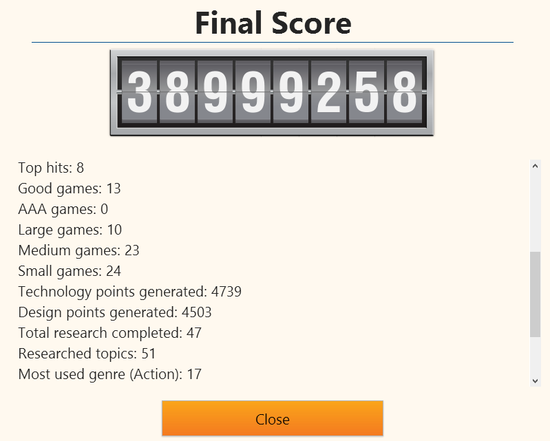 1 – Finished the in-game part of Game Dev Tycoon just now. Was very good. I might go around trying to get all of the achievements, too, but that could take a while.