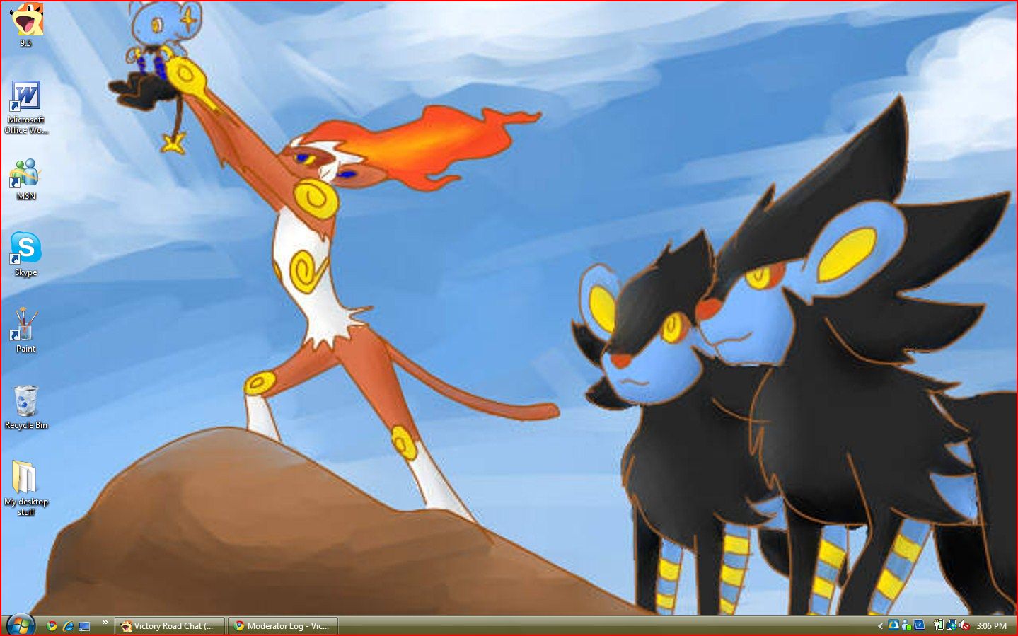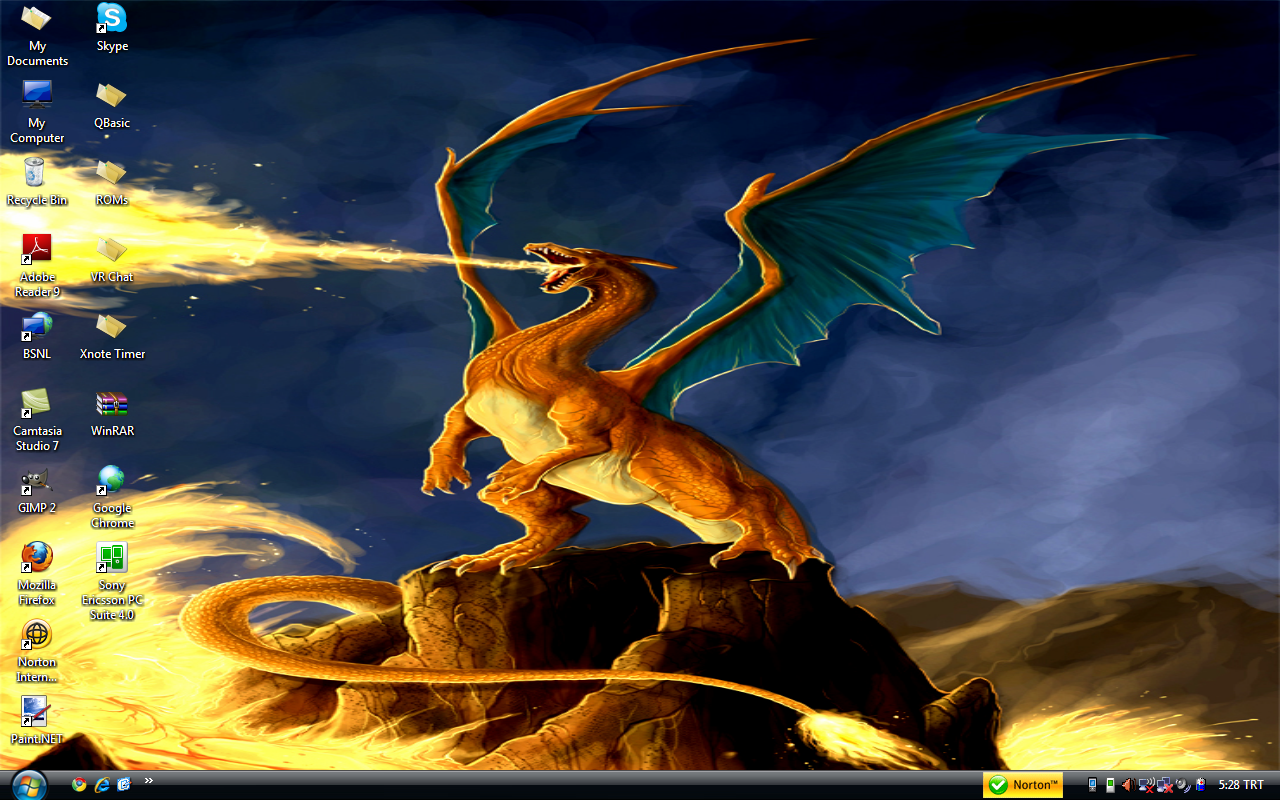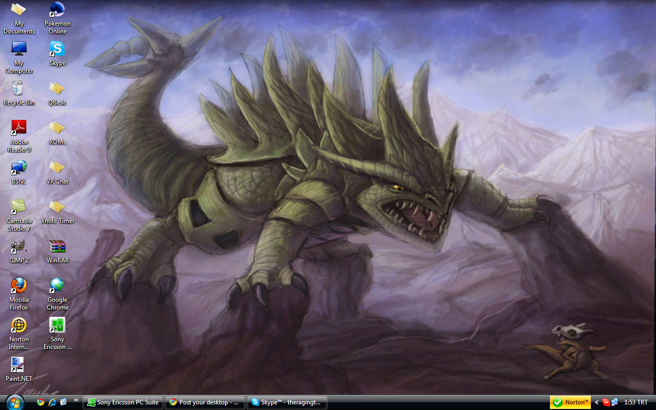 It's not SUPERHAWT like Techno's, and I have messy desktop icons, and Rainmeter isn't really doing anything other than making it a bit less un-hawt-like and showing that I'm seeding Oregon Trail II. :L The second monitor is off when I don't have VRC running because it's crap so there's nothing on it ever that's not VRC so it's not necessary so I like kittens. |