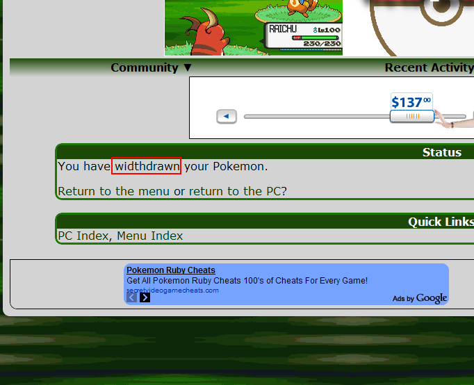 "MySQL Error Query: DELETE FROM vb_trades WHERE id=54 Error: DELETE command denied to user 'freezewarp'@'68.233.235.37' for table 'vb_trades' We were unable to remove that trade. You may want to report the problem at our forums. Return." Also Ultimazone's challenged me, but he no longer has his Pokemon, so it's telling me to contact an admin to remove the challenge. |