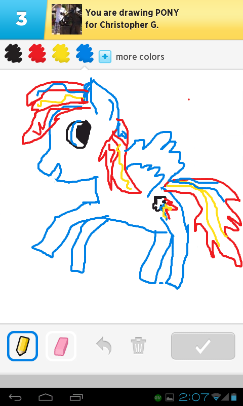 1 – TurtwigXHehe, drawsome. Literally my second round ever playing Draw Something, and I get "pony." And it's against a non-brony, GreenMan.