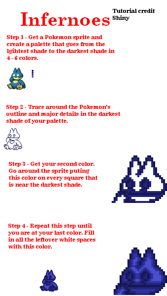 plasma recommended I take you, since he doesn't know much about infernoes anymore and wants you to get the best experience, and I agree with him. Okay, so first off, Infernoes are a really, really, basic form of spriting. It's pretty much just creating different layers of colors on a sprite. Sure they're simple, but they are also time consuming, so it requires some patience. So yeah, first off I'm gonna want you to take a look at the tutorial, as it will explain everything. Then your first assignment is: Flaming Weedle Blue Pidgey Green Ekans |