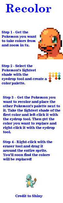 So basically you know what you are doing, right. What I usually do is tell the student the basic concept and just ask them to show me what they can do. You understand the basic tools and concept so please make brand new recolors of any Pokemon. I wish that you only swap the colors of 2 pokemon, I will teach you +3 later.