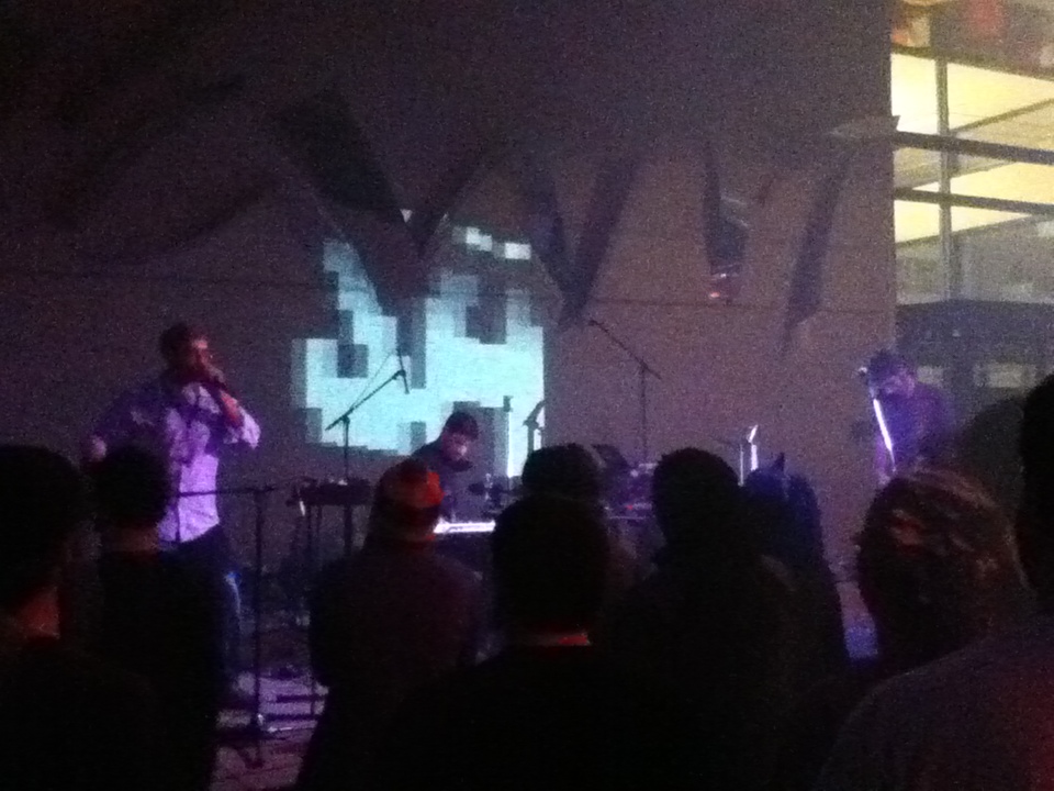 Basically, there was a monthly event called Rochester Chip going on for a couple years, and this was to celebrate its 2-year anniversary. Most of the acts were local, with the farthest ones being from New York City. The first act was called Shrimps, who did a sort of hip-hop performance. Three guys were on stage here, one with a sequencer, one with a guitar, and a special guest who did the drums on another sequencer. They remained my favorite of the night. in fact, I bought a CD from them at the merch table. The next was a three-piece chip-rock band called Chip's Challenge. They were rather interesting. My sister bought a CD from them. Next was my third favorite, Faking Amnesia, which just seemed to be one antisocial student from the college's radio station, who never seemed to look up from his Game Boy. After that, we went downstairs for dinner, completely missing most of the next performance, which I was never really interested in. Then, the one I actually bothered to look up before I went - Kris Keyser. His music is definitely full of energy, and he danced himself breathless on stage after just one song. Then... I completely lost track after that. I think the next one up was Bit Runner, but my sister and I were sick of it by that point and just left. We did get a couple other things from the merch table, though; myself a poster, and my sister a modded gray-brick Game Boy, which appears to have a backlight, new buttons, a Pro Sound port, and a new case.