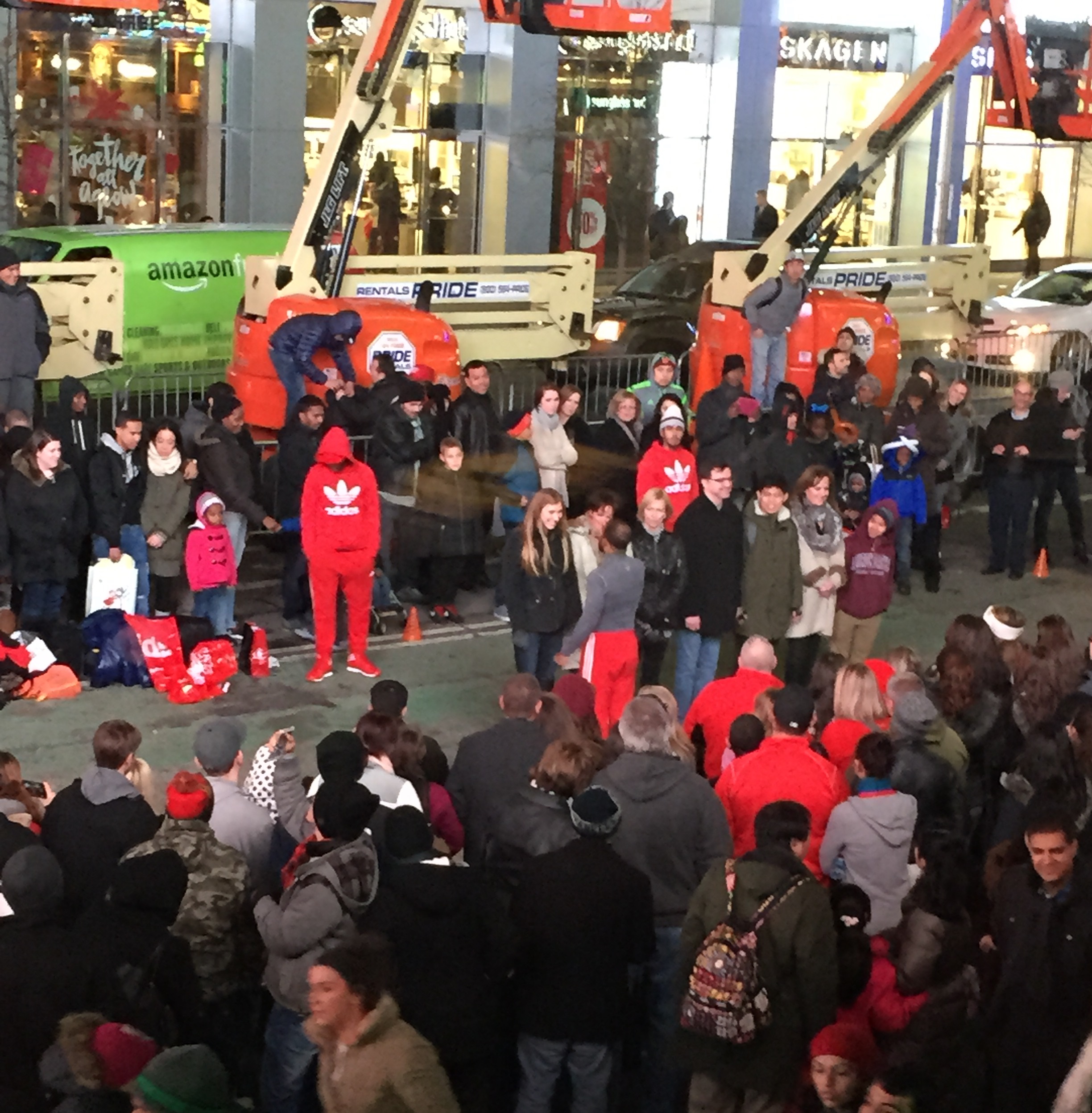 My family and I went on a vacation to this city last weekend. So my dad ended up driving us on Friday, and I got carsick, so I didn't really have an appetite for a while. The hotel we stayed at was right next to Times Square. The rooms were sooooo nice, I wish I could go back soon. We ate dinner at an Olive Garden. While we were waiting for our table, we saw a couple street performers. They were lining people up and jumping over them. It was quite fun to watch, I got a picture of it from the restaurant window.