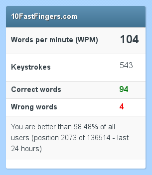 I tried this just now on a phone. Not going to bother to grab a screenshot, but I scored an amazing 19 wpm with 12/108 incorrect keystrokes, 18 correct words and 2 wrong words. Which is apparently better than 14.2% of all users.