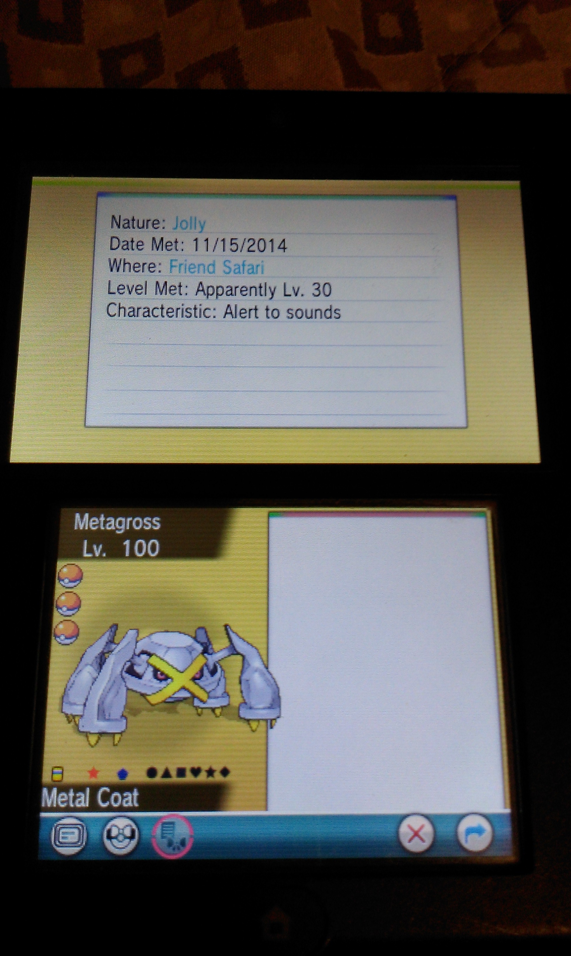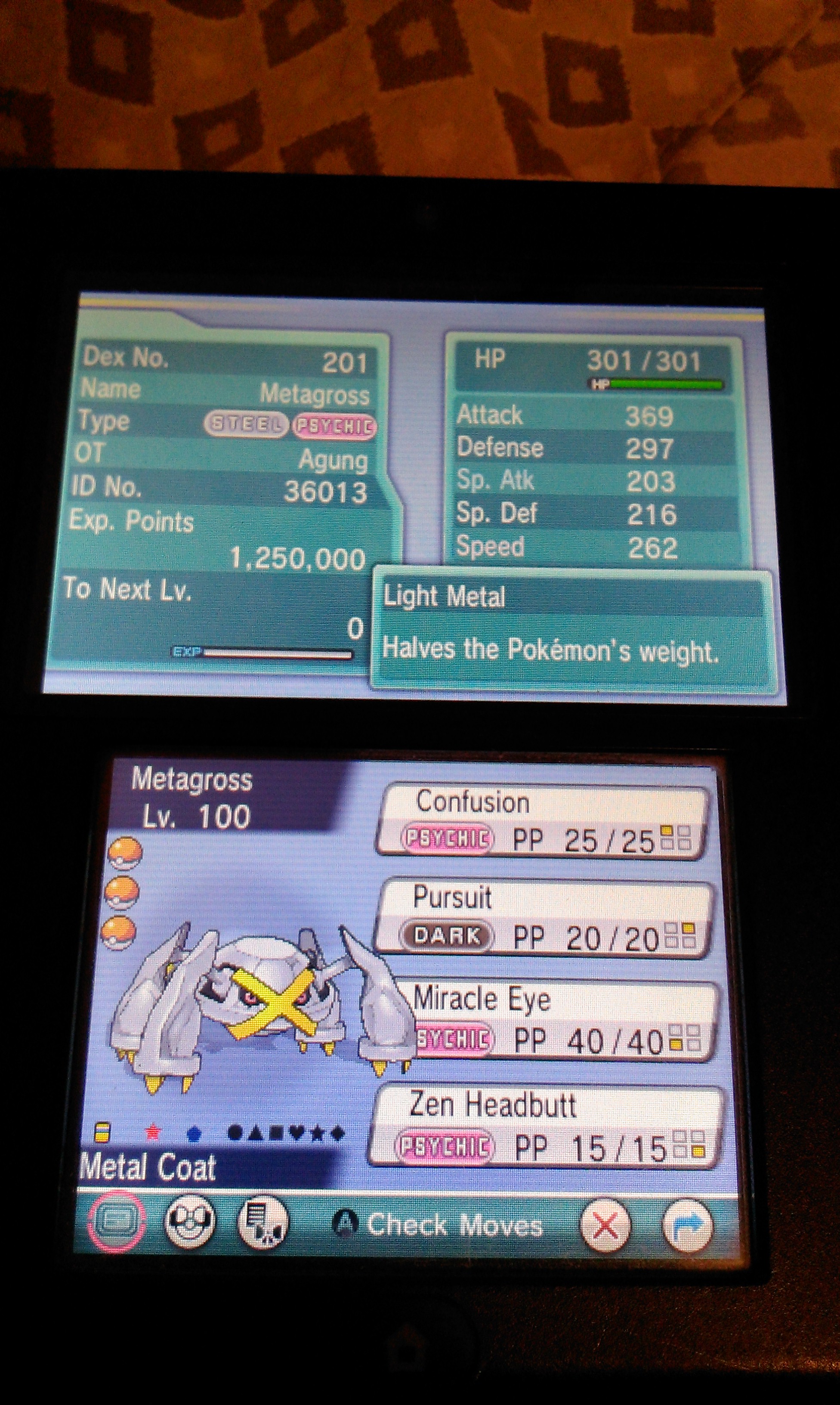 Adamant Shiny event Beldum, Metagrossite, level 9 (going to stop obeying me soon D: ), Hold Back, Iron Head, Zen Headbutt, Iron Defense