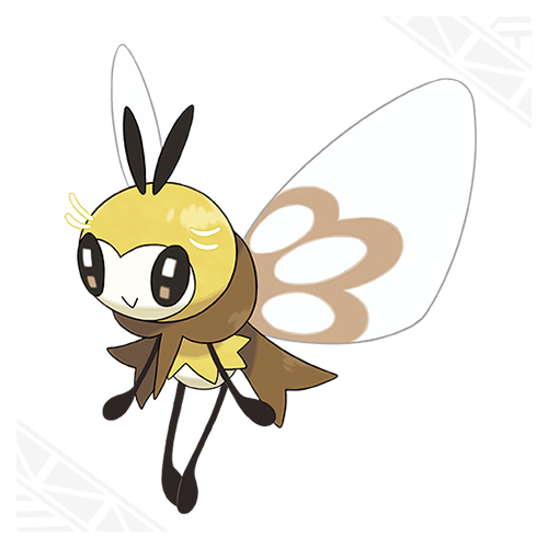 Ribombee evolves from Cutiefly, is Bug-/Fairy-type, and has the abilities Honey Gather or Shield Dust.