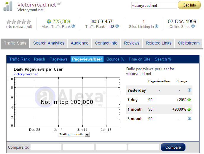 I was looking at Victory Road's statistics on Alexa and noticed one of the numbers was "+9000%" indicating an increase of 9000% in the last month (assumingly because Victory Road wasn't claimed the month prior.