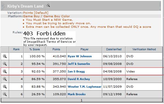 The game I did it on was Kirby's Dream Land. The score was verified by Twin Galaxies on 4/08/2008. There have since been two other scores that have beat it. I have attached a screen grab off of the Twin Galaxies website of the current scores for that game (as of 7/02/2010). I made sure to highlight my score with a red border.