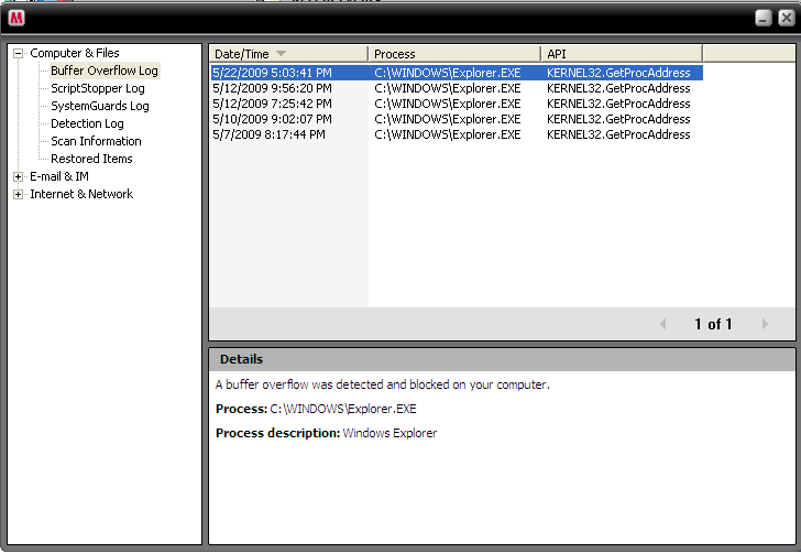 Windows Explorer recently executed a buffer overflow on my XP system. McAfee promptly blocked it. No picture, sorry. EDIT: Just an update to say that they continue to pop up frequently. I will try to get a pic next time it happens.