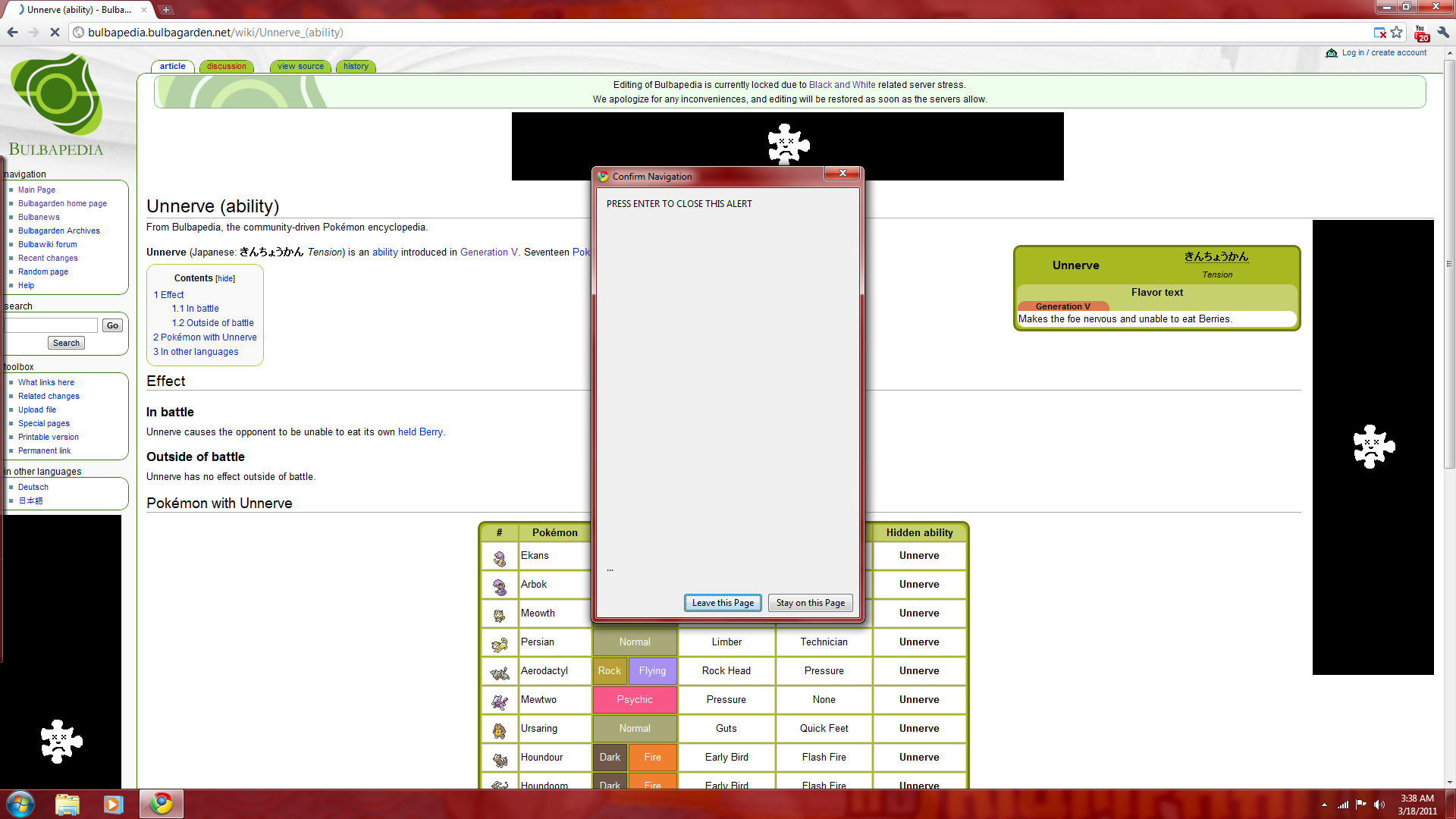 I was on Bulbapedia when I decided to look up an ability. That page had a malicious banner ad at the bottom of the page that caused Flash to crash and caused a dumb error message to appear when trying to navigate away from the page or trying to close the browser. I eventually used Task Manager to kill the process, but not before taking a screen grab!