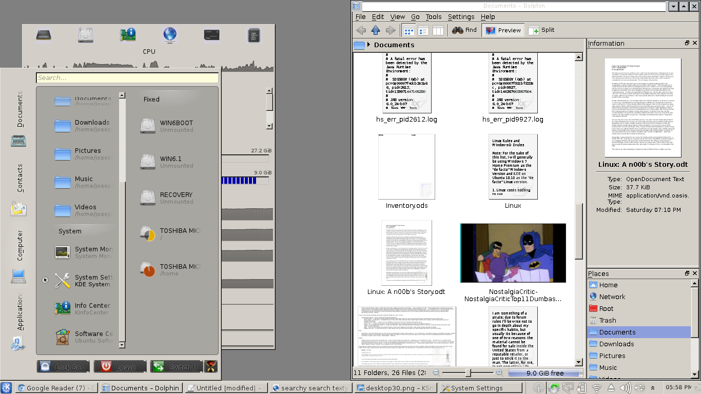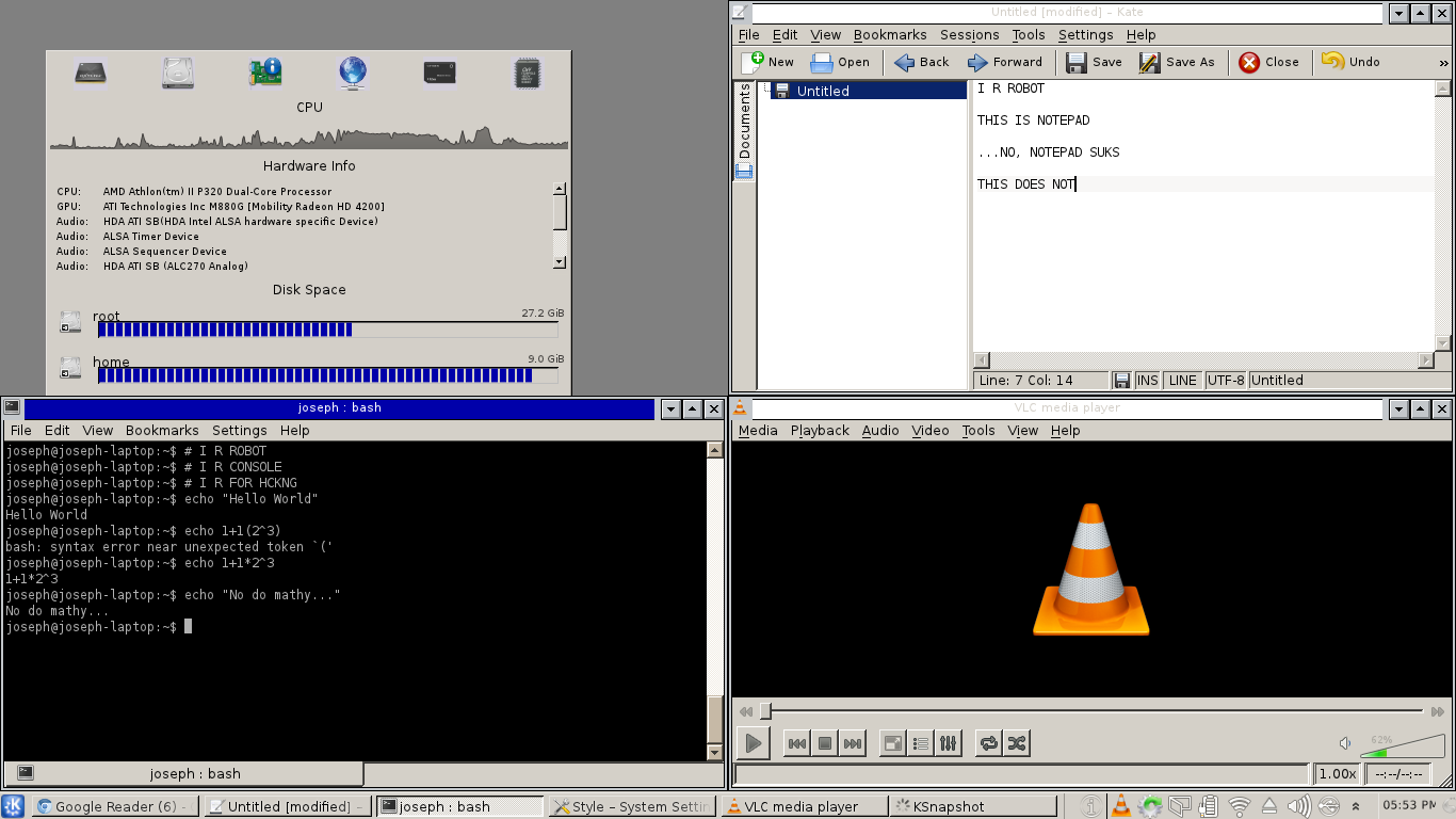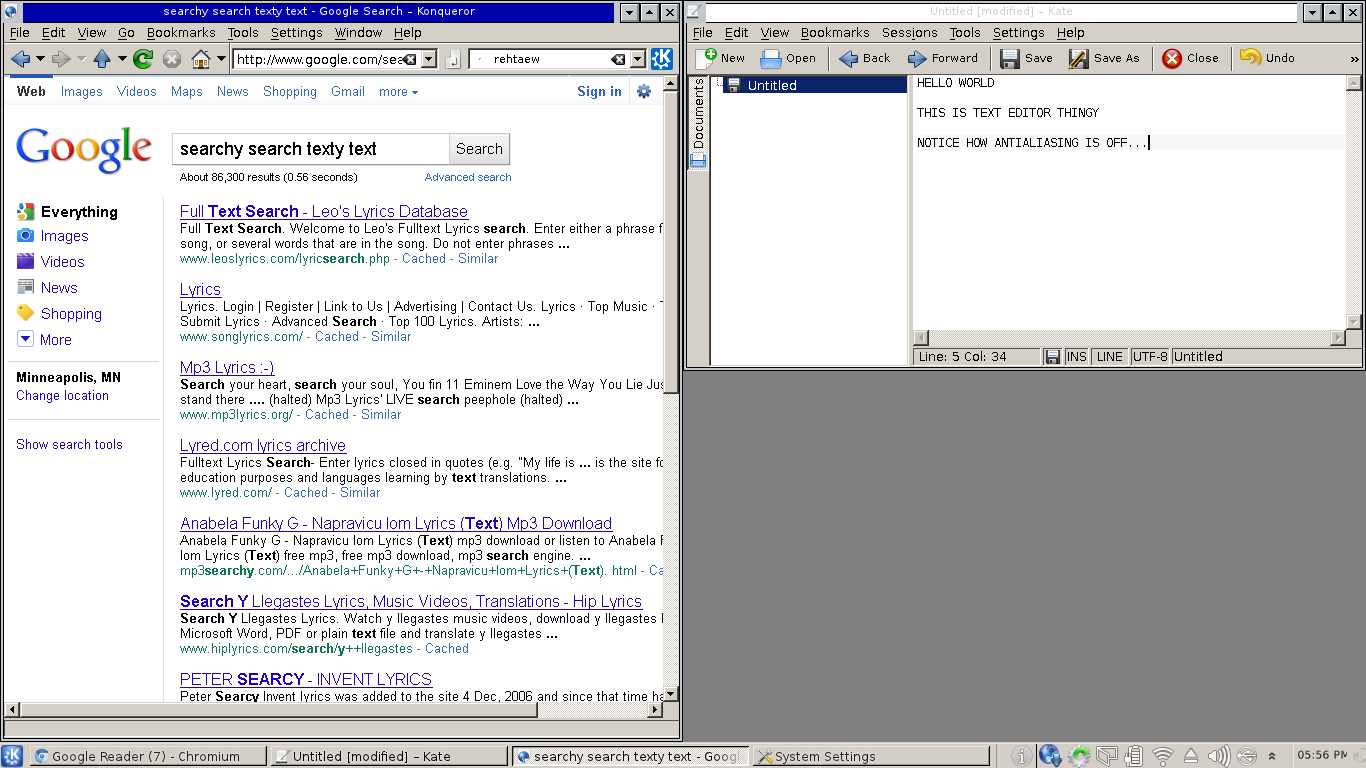 Last weekend while stranded in Wisconsin (...and or enjoying Easter dinner), I decided to pass the time throwing the following experiment together with KDE 4.6. The first screenshot enables Anti-Aliasing, the other two don't.